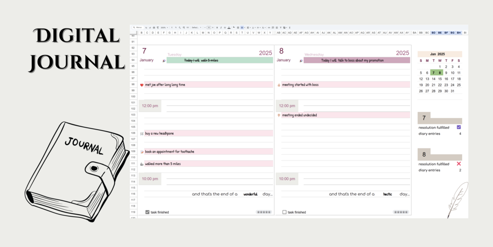Take charge of your resolutions with a dedicated section for goals. Set your objectives, track your progress, and update the completion status with simple dropdowns or checkboxes. Watch your achievements come to life!