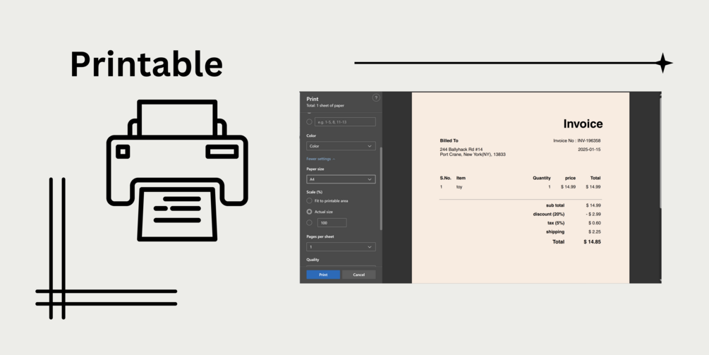 - Minimalist & Professional Design – Generates a standard A4-sized invoice with a clean, print-ready layout.