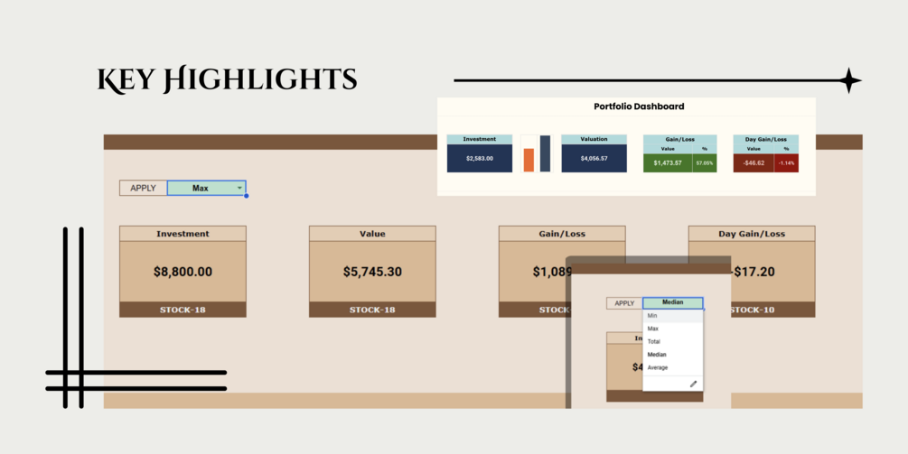 - Min, Max, Median, and Average Calculations: Select these statistics via a dropdown to analyze stock-specific data quickly.
